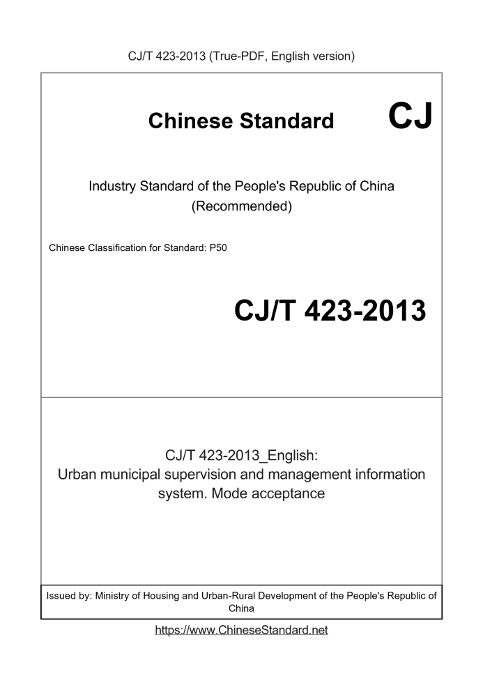 Delivery: <= 3 days. True-PDF full-copy in English will be manually translated and delivered via email. CJ/T 423-2013: Urban municipal supervision and management information system. Mode acceptance Status: Valid
