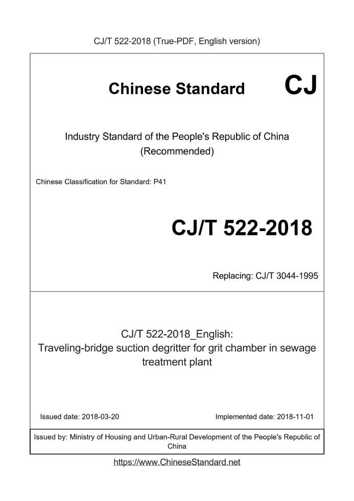 Delivery: <= 3 days. True-PDF full-copy in English will be manually translated and delivered via email. CJ/T 522-2018: Traveling-bridge suction degritter for grit chamber in sewage treatment plant Status: Valid