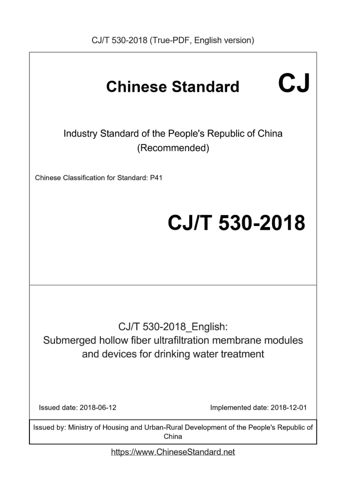 Delivery: <= 4 days. True-PDF full-copy in English will be manually translated and delivered via email. CJ/T 530-2018: Submerged hollow fiber ultrafiltration membrane modules and devices for drinking water treatment Status: Valid