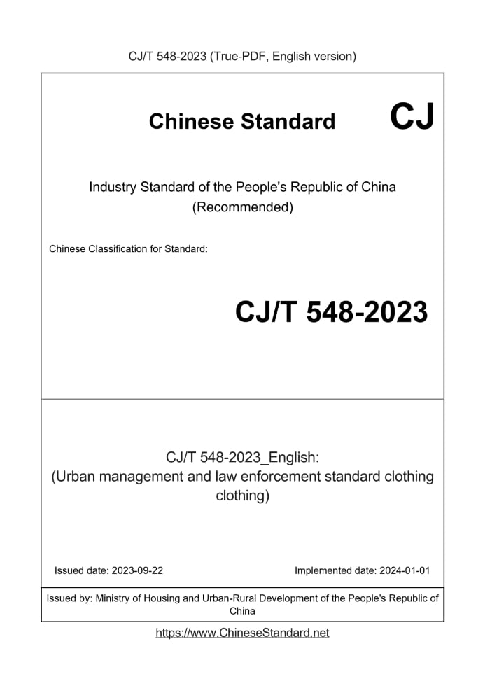 Delivery: <= 8 days. True-PDF full-copy in English will be manually translated and delivered via email. CJ/T 548-2023: (Urban management and law enforcement standard clothing clothing) Status: Valid