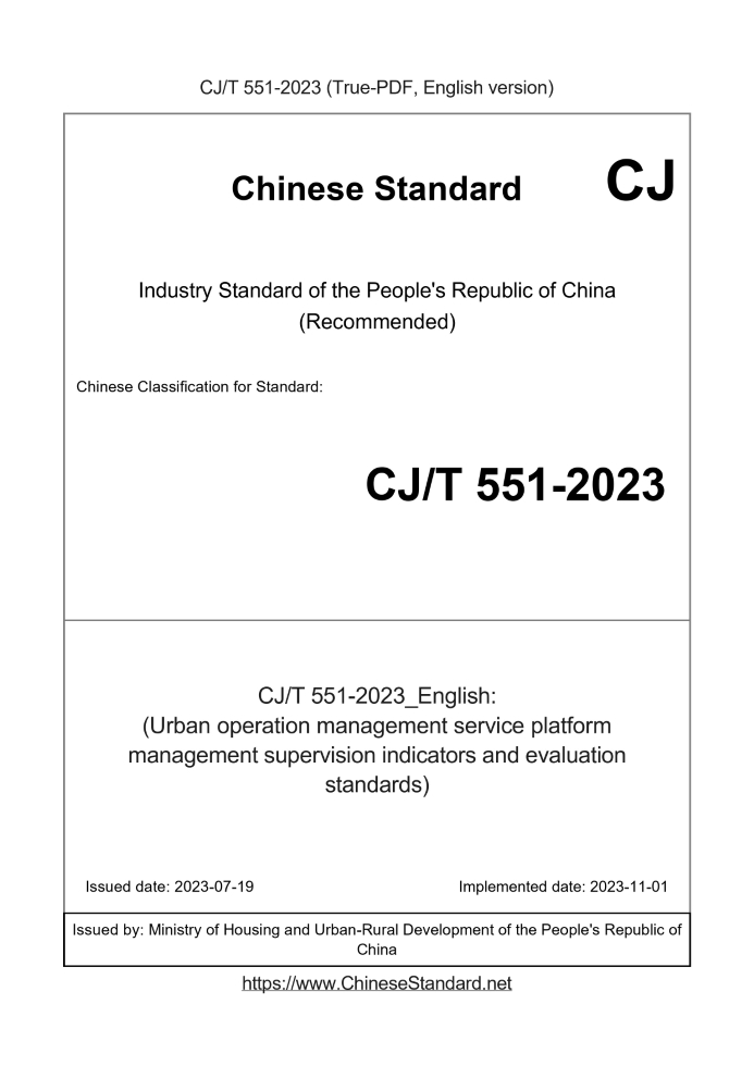 Delivery: <= 8 days. True-PDF full-copy in English will be manually translated and delivered via email. CJ/T 551-2023: (Urban operation management service platform management supervision indicators and evaluation standards) Status: Valid