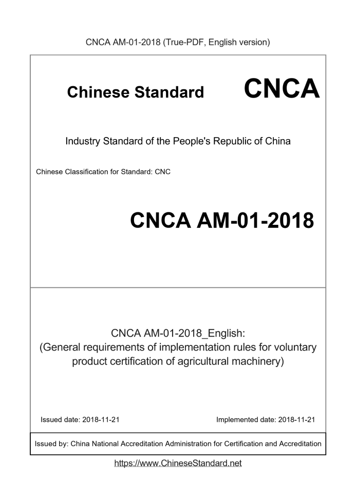 Delivery: <= 5 days. True-PDF full-copy in English will be manually translated and delivered via email. CNCA AM-01-2018: (General requirements of implementation rules for voluntary product certification of agricultural machinery)