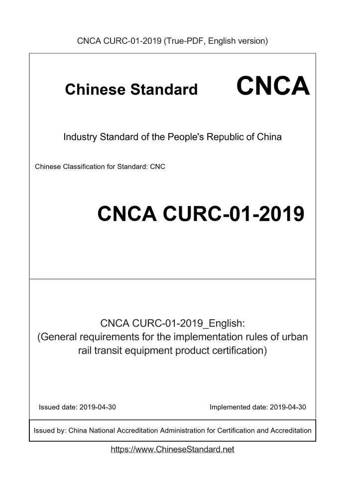 Delivery: <= 4 days. True-PDF full-copy in English will be manually translated and delivered via email. CNCA CURC-01-2019: (General requirements for the implementation rules of urban rail transit equipment product certification)