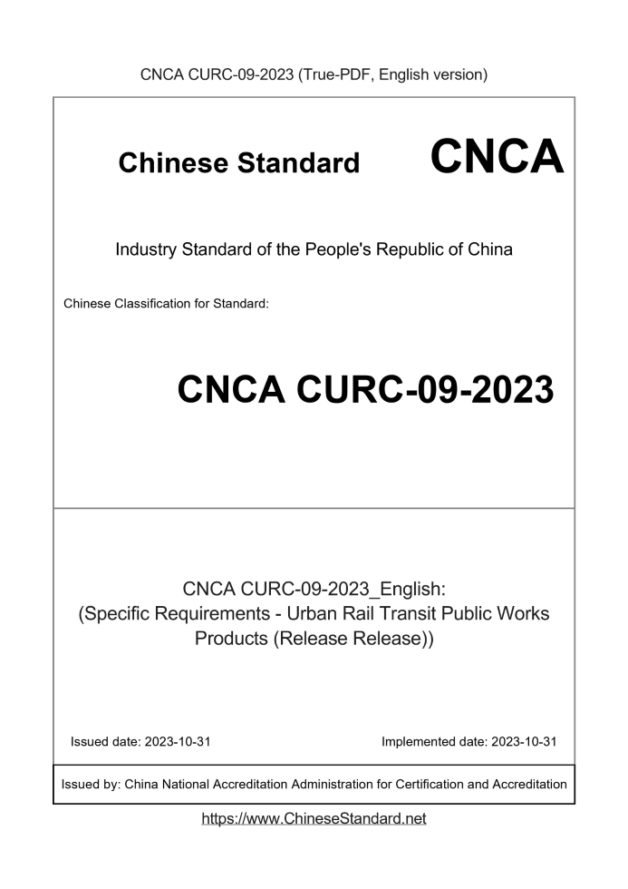 Delivery: <= 6 days. True-PDF full-copy in English will be manually translated and delivered via email. CNCA CURC-09-2023: (Specific Requirements - Urban Rail Transit Public Works Products (Release Release)) Status: Valid