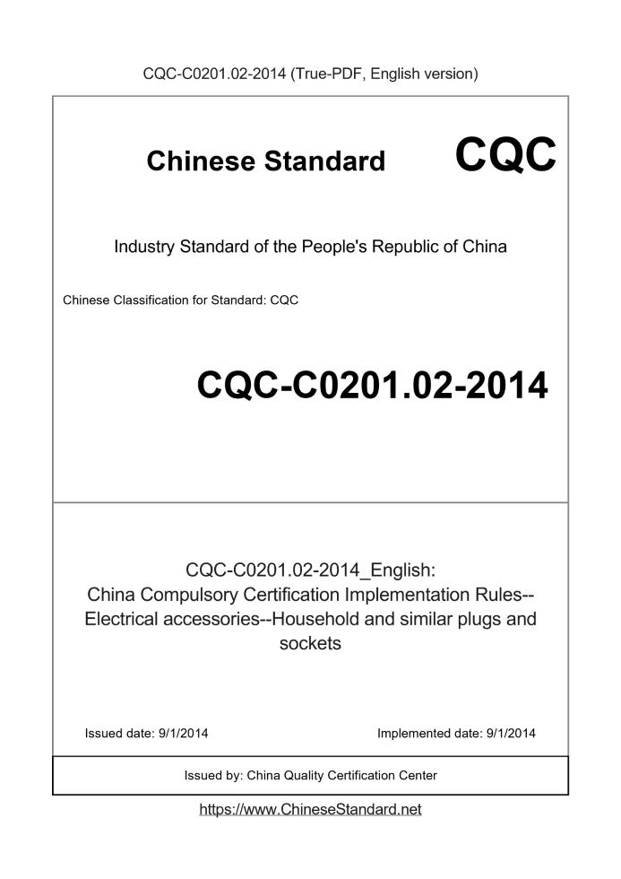 Delivery: <= 7 days. True-PDF full-copy in English will be manually translated and delivered via email. CQC-C0201.02-2014: China Compulsory Certification Implementation Rules--Electrical accessories--Household and similar plugs and sockets