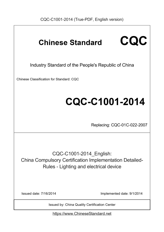 Delivery: <= 10 days. True-PDF full-copy in English will be manually translated and delivered via email. CQC-C1001-2014: China Compulsory Certification Implementation Detailed-Rules - Lighting and electrical device