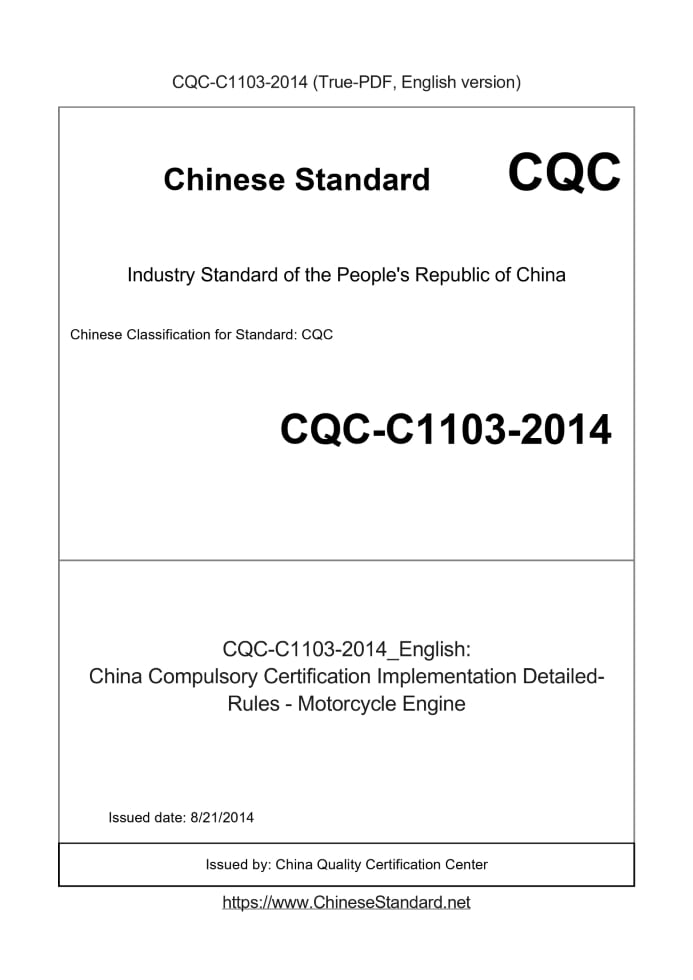 Delivery: <= 7 days. True-PDF full-copy in English will be manually translated and delivered via email. CQC-C1103-2014: China Compulsory Certification Implementation Detailed-Rules - Motorcycle Engine