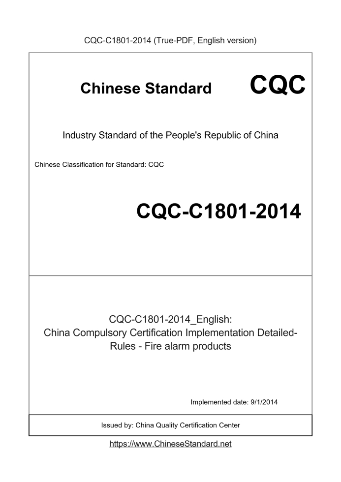 Basic dataStandard ID: CQC-C1801-2014 (CQC C1801-2014; CQC-C18-01-2014; CQC-C1801-2014)Description (Translated English): China Compulsory Certification Implementation Detailed-Rules - Fire alarm products Sector / Industry: China Quality Certification Center - CCC Implementation Detailed-Rules Classification of Chinese Standard: CQC Date of Implementation: 9/1/2014 Regulation (derived from): Notice No. 15 of 2014 Issuing agency(ies): China Quality Certification Center Summary: This document specifies the China Compulsory Certification (CCC) implementation Detailed-Rules for Fire alarm products. This document defines the Fire alarm products's certification unit; certification entrusting; document requirements; sample requirement Tips & Frequently Asked Questions:Question 1: How long will the true-PDF of CQC-C1801-2014_English be delivered?Answer: Upon your order, we will start to translate CQC-C1801-2014_English as soon as possible, and keep you informed of the progress. The lead time is typically 1 ~ 3 working days. The lengthier the document the longer the lead time.Question 2: Can I share the purchased PDF of CQC-C1801-2014_English with my colleagues?Answer: Yes. The purchased PDF of CQC-C1801-2014_English will be deemed to be sold to your employer/organization who actually pays for it, including your colleagues and your employer's intranet.Question 3: Does the price include tax/VAT?Answer: Yes. Our tax invoice, downloaded/delivered in 9 seconds, includes all tax/VAT and complies with 100+ countries' tax regulations (tax exempted in 100+ countries) -- See Avoidance of Double Taxation Agreements (DTAs): List of DTAs signed between Singapore and 100+ countriesQuestion 4: Do you accept my currency other than USD?Answer: Yes. If you need your currency to be printed on the invoice, please write an email to Sales@ChineseStandard.net. In 2 working-hours, we will create a special link for you to pay in any currencies. Otherwise, follow the normal steps: Add to Cart -- Checkout -- Select your currency to pay. |