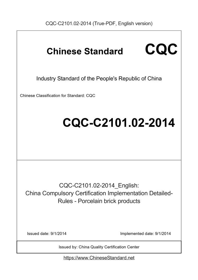 Delivery: <= 6 days. True-PDF full-copy in English will be manually translated and delivered via email. CQC-C2101.02-2014: China Compulsory Certification Implementation Detailed-Rules - Porcelain brick products