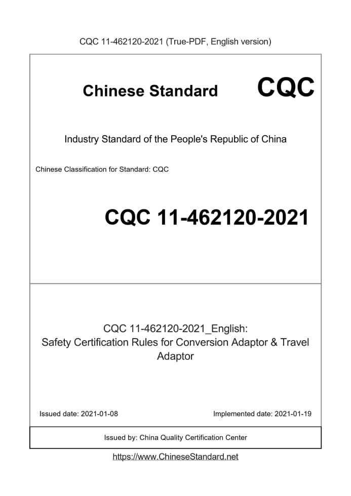 Delivery: <= 3 days. True-PDF full-copy in English will be manually translated and delivered via email. CQC11-462120-2021: Safety Certification Rules for Conversion Adaptor & Travel Adaptor