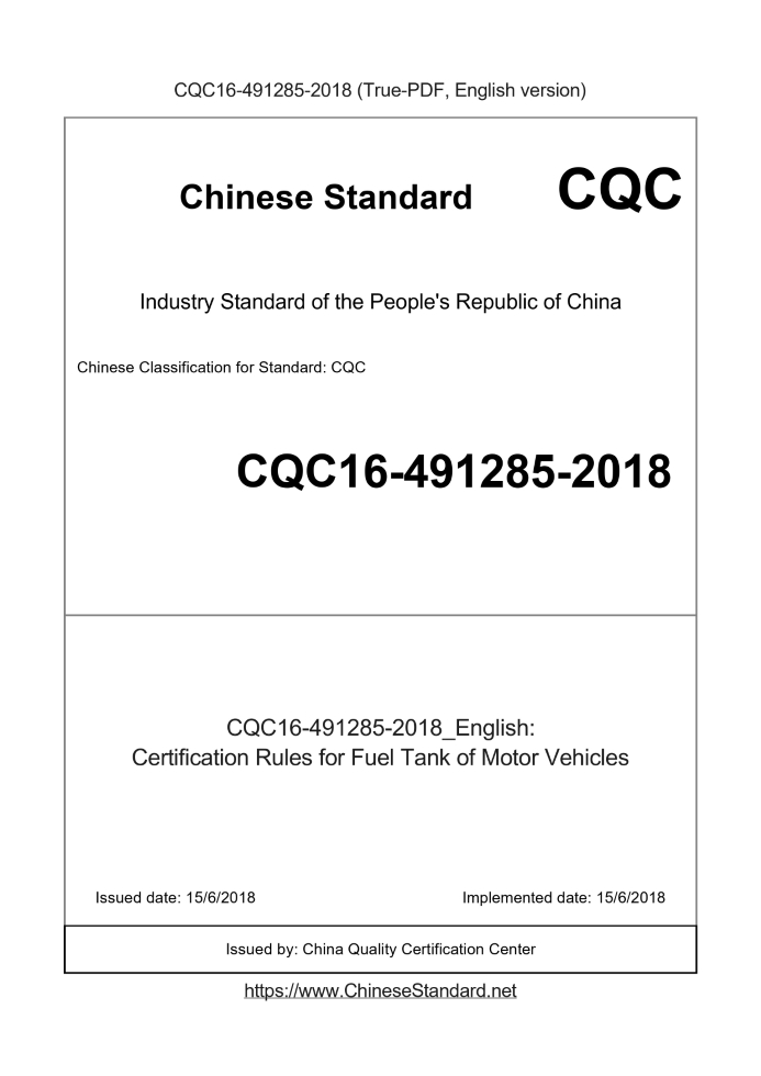 Delivery: <= 4 days. True-PDF full-copy in English will be manually translated and delivered via email. CQC16-491285-2018: Certification Rules for Fuel Tank of Motor Vehicles