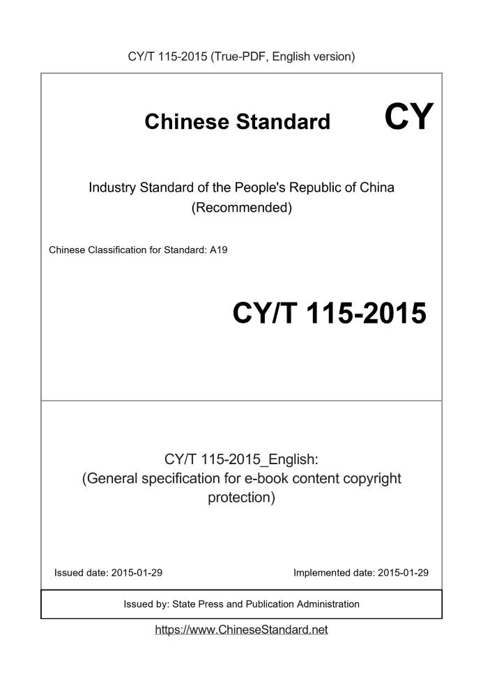Delivery: <= 3 days. True-PDF full-copy in English will be manually translated and delivered via email. CYT115-2015: (General specification for e-book content copyright protection) Status: Valid