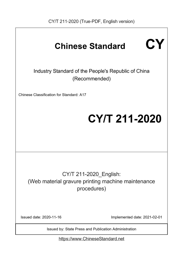 Delivery: <= 3 days. True-PDF full-copy in English will be manually translated and delivered via email. CYT211-2020: (Web material gravure printing machine maintenance procedures) Status: Valid