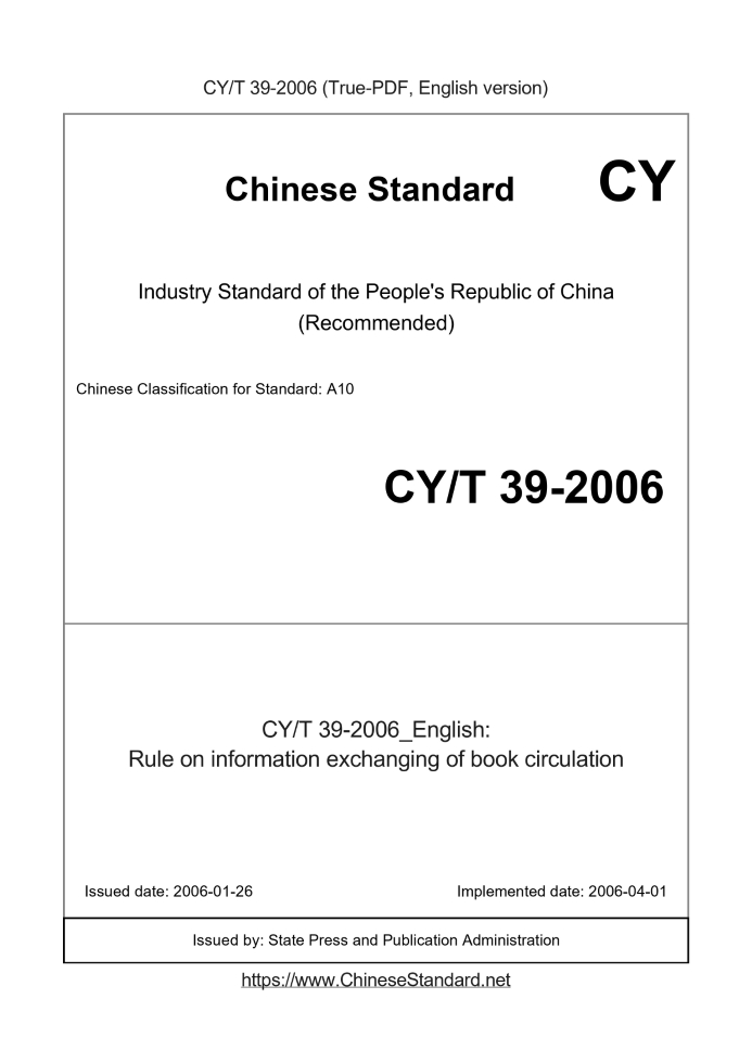 Basic dataStandard ID: CY/T 39-2006 (CY/T39-2006)Description (Translated English): Rule on information exchanging of book circulation Sector / Industry: Press & Publication Industry Standard (Recommended) Classification of Chinese Standard: A10 Classification of International Standard: 01.140.30; 35.240.60 Word Count Estimation: 180,171 Date of Issue: 2006-01-26 Date of Implementation: 2006-04-01 Quoted Standard: GB/T 1988-1998; GB/T 2312; GB/T 2659-2000; GB/T 2901-1992; GB/T 3792.2-1985; GB/T 4880.1-2005; GB/T 5795-2002; GB/T 7408-2005; GB 11714-1997; GB/T 12450-2001; GB/T 12451-2001; GB 13000.1; GB/T 18793-2002; CY/T 8-1993; WH/T 0503-1996 Issuing agency(ies): State Press and Publication Administration Summary: This standard specifies the content of China 's book circulation information exchange, types and formats. This standard applies to the circulation of books in Chinese exchange and sharing of information. CYT39-2006: Rule on information exchanging of book circulation---This is a DRAFT version for illustration, not a final translation. Full copy of true-PDF in English version (including equations, symbols, images, flow-chart, tables, and figures etc.) will be manually/carefully translated upon your order.Rule on information exchanging of book circulation ICS 01.140.30; 35.240.60 A10 Record number. 17164-2006 People's Republic of China Press and Publication Industry Standard CY/T 39-2006 Book circulation information exchange rules Released on.2006-01-26 2006-04-01 implementation Press and Publication Administration of the People's Republic of China ContentForeword I Introduction II 1 Scope 1 2 Normative references 1 3 Terms and Definitions 1 4 data elements 3 5 Text file exchange rules 15 6 XML file exchange rules 27 Appendix A (informative) XMLSchema 96 Appendix B (informative) Sample exchanging data content 164 Appendix C (informative) Text file data output style 167 Appendix D (informative) XML file output example 172 CY/T 39-2006ForewordAppendix A, Appendix B, Appendix C and Appendix D of this standard are informative annexes. This standard was proposed by the National Publications Standardization Technical Committee. This standard is under the jurisdiction of the National Publications Standardization Technical Committee. This standard was drafted. Publications Management Department of the General Administration of Press and Publication of the People's Republic of China, Xinhua Bookstore Group of Zhejiang Province, new Huashudian Head Office, Shanghai Xinhua Distribution Group, Electronic Industry Press, Beijing Branch Paper Industry Information Technology Co., Ltd. (Dangdang). The main drafters of this standard. Zhang Fuhai, Zhou Liwei, Bai Xiaowei, Chen Yun, Pan Mingqing, Li Liequn, Wu Jian, Yang Jianzhong, Du Chaoyu. This standard is approved by the General Administration of Press and Publication of the People's Republic of China This standard is interpreted by the National Publications Standardization Technical Committee. CY/T 39-2006Introduction0.1 The purpose of this standard is to promote the exchange of information between the Chinese book publishing distribution chain, through the complete definition of the book commodity letter Information and content exchange rules and rules in the circulation of books and commodities, standardizing the information systems of enterprises in the book publishing and supply chain Data interface, enabling inter-enterprise databases to provide each other with the required data in a standard format to achieve the entire publishing supply chain and information chain The data transmission of the system is simplified. Each database owner only needs to convert the internal format and standard format of their database. It can reach the interconnection of information of various enterprises in the supply chain. This standard only specifies the content, format and logical structure of the exchange, not for the length of each record. Make a definition. 0.2 This standard applies to publishing, publishing, online bookstores, libraries and other units to acquire, exchange and share book stream communication. The need for interest. All the above-mentioned enterprises and enterprises can refer to this standard and select the data content to be exchanged according to the actuality of the book circulation business. 0.3 This standard starts from the advanced nature and practicality, considers the current situation of the publication publishing industry and the development trend of network technology, and exchanges texts. The text file and XML formats are used as the format for information exchange between computer software systems. Where text file references GB/T 2901-1992 "Tape format for information exchange" (neq ISO 2709.1981). Information exchange rules in two formats are in the logic The series is consistent, and through the definition of the identifier, the correspondence between the data content of the two file types is established. 0.4 The concept of book commodity circulation data items expressed in this standard refers to the relevant standards of published publications. In the current relevant standards The concept does not apply to the current status of the book circulation industry, and this standard has been re-stated. 0.5 This standard does not use code to maintain and enforce this standard for data items that do not need to be unified and may change. The operability. CY/T 39-2006 Book circulation information exchange rules1 ScopeThis standard specifies the content, type and format of book circulation information exchange in China. This standard applies to the exchange and sharing of book circulation information in China.2 Normative referencesThe terms in the following documents become the terms of this standard by reference to this standard. All dated references, followed by all Modifications (not including errata content) or revisions do not apply to this standard, however, parties to agreements based on this standard are encouraged to st