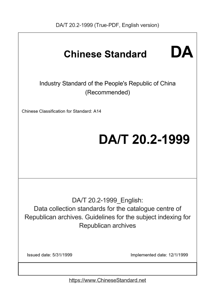 Delivery: <= 2 days. True-PDF full-copy in English will be manually translated and delivered via email. DAT20.2-1999: Data collection standards for the catalogue centre of Republican archives. Guidelines for the subject indexing for Republican archives Status: Obsolete