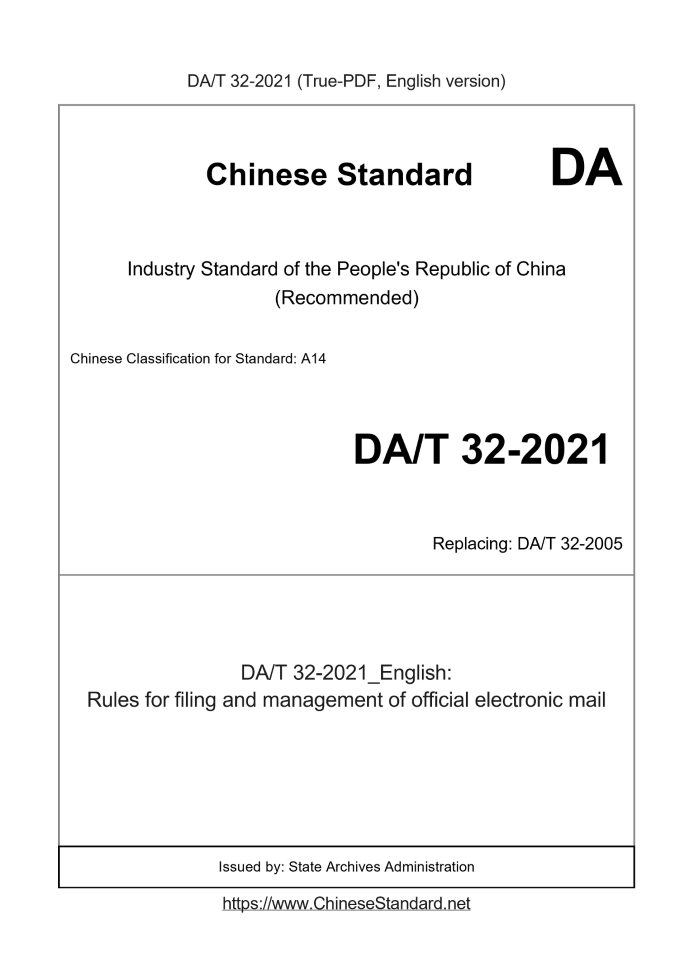 Delivery: <= 3 days. True-PDF full-copy in English will be manually translated and delivered via email. DAT32-2021: Rules for filing and management of official electronic mail Status: Valid DAT32: Historical versions