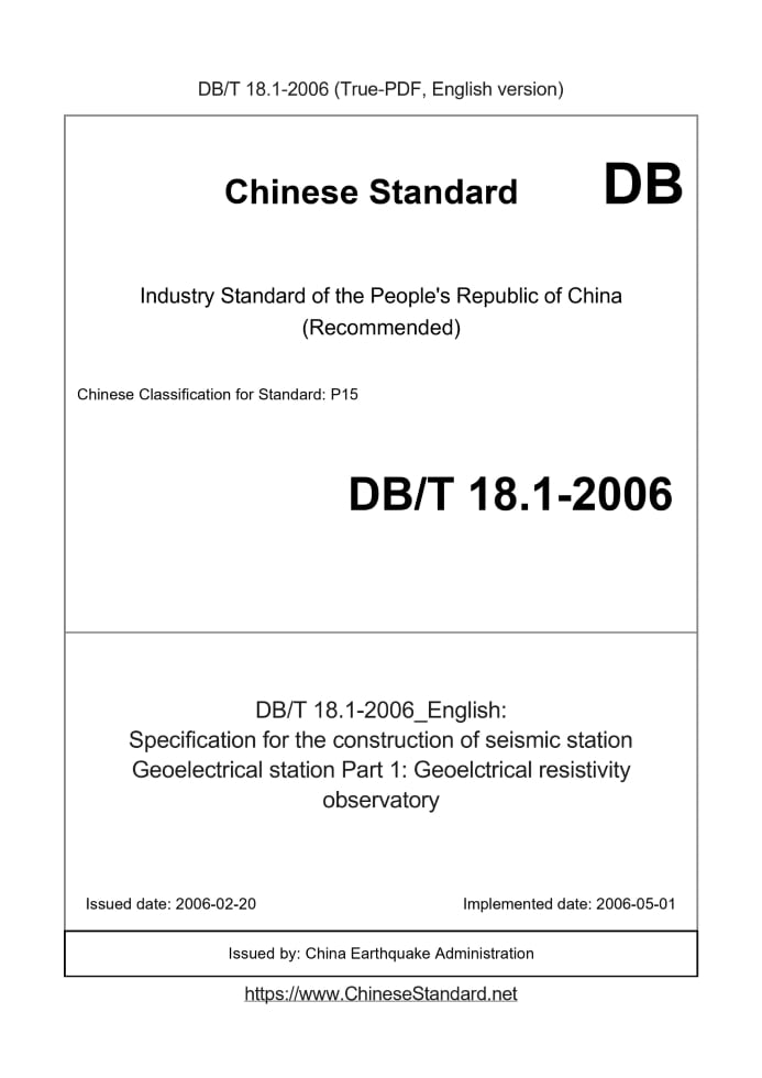 Delivery: <= 4 days. True-PDF full-copy in English will be manually translated and delivered via email. DBT18.1-2006: Specification for the construction of seismic station Geoelectrical station Part 1: Geoelctrical resistivity observatory Status: Valid