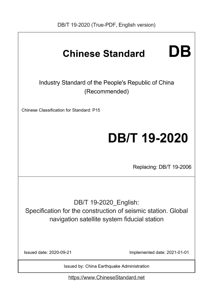 Delivery: <= 5 days. True-PDF full-copy in English will be manually translated and delivered via email. DBT19-2020: Specification for the construction of seismic station. Global navigation satellite system fiducial station Status: Valid DBT19: Historical versions