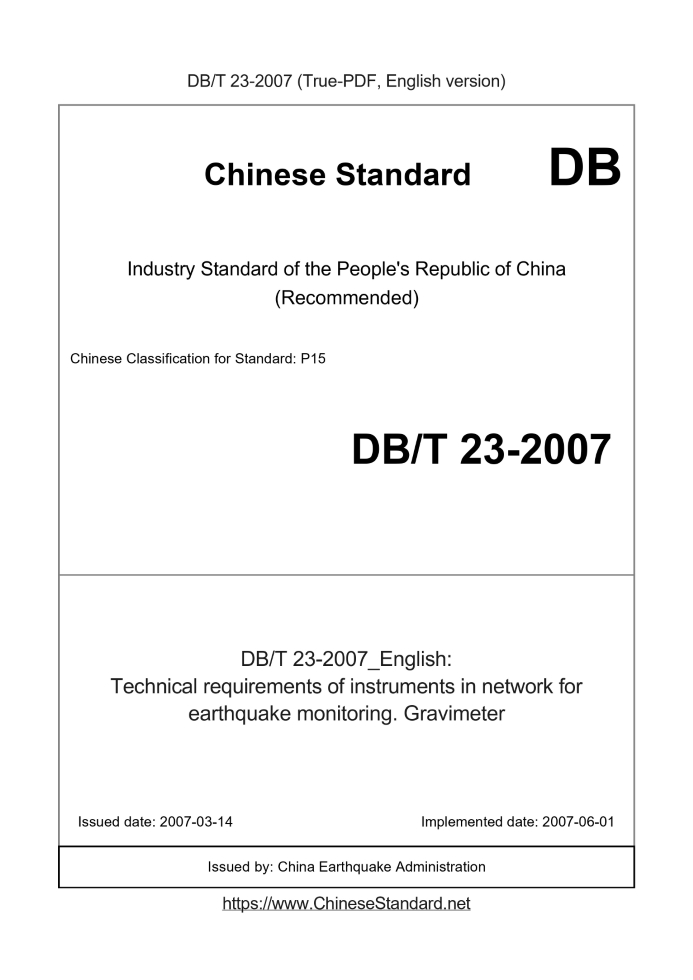 Delivery: <= 5 days. True-PDF full-copy in English will be manually translated and delivered via email. DBT23-2007: Technical requirements of instruments in network for earthquake monitoring. Gravimeter Status: Valid