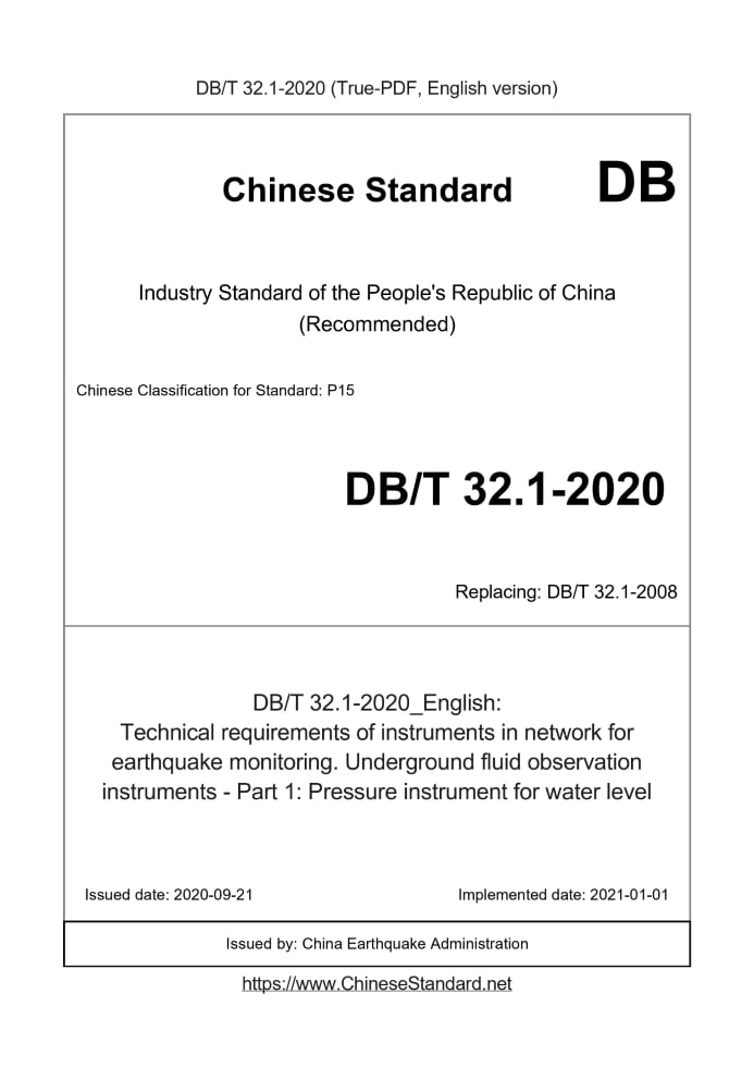 Basic dataStandard ID: DB/T 32.1-2020 (DB/T32.1-2020)Description (Translated English): Technical requirements of instruments in network for earthquake monitoring. Underground fluid observation instruments - Part 1: Pressure instrument for water level Sector / Industry: Chinese Industry Standard (Recommended) Classification of Chinese Standard: P15 Classification of International Standard: 91.120.25 Word Count Estimation: 20,246 Date of Issue: 2020-09-21 Date of Implementation: 2021-01-01 Older Standard (superseded by this standard): DB/T 32.1-2008 Quoted Standard: GB 4706.1-2005; GB/T 6587-2012; DB/T 3; DB/T 4; DB/T 51-2012 Regulation (derived from): State-Earthquake Announcement (2020) No. 54 Issuing agency(ies): China Earthquake Administration Summary: This standard specifies the technical requirements and testing methods for the pressure water level gauges in seismic observation instruments to enter the network. This standard applies to the design, production, testing, use, maintenance, introduction and quality supervision of pressure water level gauges in seismic observation instruments. DBT32.1-2020: Technical requirements of instruments in network for earthquake monitoring. Underground fluid observation instruments - Part 1: Pressure instrument for water level---This is a DRAFT version for illustration, not a final translation. Full copy of true-PDF in English version (including equations, symbols, images, flow-chart, tables, and figures etc.) will be manually/carefully translated upon your order. Technical requirements of instruments in network for earthquake monitoring.Underground fluid observation instruments - Part 1.Pressure instrument for water level ICS 91.120.25 CCSP15 People's Republic of China Earthquake Industry Standard Replace DB/T 32.1-2008 Technical requirements for seismic observation instruments into the network Underground fluid observation instrument Part 1.Pressure type water level gauge 2020-09-21 release 2021-01-01 implementation Issued by China Earthquake Administration Table of contentsForeword Ⅲ Introduction Ⅴ 1 Scope 1 2 Normative references 1 3 Terms and definitions 1 4 Technical requirements 2 5 Detection method 3 Appendix A (Normative) Measurement range and maximum allowable error index test 6 Appendix B (Normative) Detection of Resolution Index 8 Appendix C (Normative) Instrument drift index detection 9 Appendix D (Normative) Water level change response speed index detection 11 Appendix E (Normative) DC Power Consumption Index Test 12 Appendix F (Normative) Working Voltage Adaptability Test 13 Reference 15ForewordThis document is in accordance with the provisions of GB/T 1.1-2020 "Guidelines for Standardization Work Part 1.Structure and Drafting Rules of Standardization Documents" Drafting. This document is one of the series of standards in the "Technical Requirements for Seismic Observation Instruments' Network Access" "Technical Requirements for Seismic Observation Instruments' Network Access" series of standards The quasi-structure and name are as follows. ---Common technical parameter expressions and test methods for the technical requirements of seismic observation instruments into the network (DB/T 21-2007) ---Technical requirements for seismological observation instruments into the network Seismograph (DB/T 22-2020) ---Technical requirements for seismic observation instruments into the network gravimeter (DB/T 23-2007) ---Technical requirements for seismic observation instrument access to the grid. Geoelectricity observation instrument Part 1.DC earth resistivity meter (DB/T 29.1-2008) ---Technical requirements for the network access of seismic observation instruments. Geoelectric observation instrument Part 2.Geoelectric field instrument (DB/T 29.2-2008) ---Technical requirements for seismic observation instruments into the network. Geomagnetic observation instrument Part 1.Fluxgate magnetometer (DB/T 30.1-2008) ---Technical requirements for the network access of seismic observation instruments. Geomagnetic observation instrument Part 2.Proton vector magnetometer ((DB/T 30.2-2008) ---Technical requirements for seismic observation instruments into the network. Crustal Deformation Observer Part 1.Inclinometer (DB/T 31.1-2008) ---Technical requirements for seismic observation instruments into the network. Crustal Deformation Observer Part 2.Strain Gauge (DB/T 31.2-2008) ---Technical requirements for seismic observation instruments into the network. Underground fluid observation instrument. Part 2.Thermometer (DB/T 32.2-2008) ---Technical requirements for seismic observation instruments into the network. Underground fluid observation instrument. Part 3.Scintillation radon instrument (DB/T 32.3-2008) ---Technical requirements for the network access of seismic observation instruments Seismic intensity meter (DB/T 59-2015) This document is part 1 of DB/T 32. This document replaces DB/T 32.1-2008 "Technical Requirements for Seismic Observation Instruments Access to Networks. Underground Fluid Observation Apparatus Part 1.Pressure Type Water level gauge. Compared with DB/T 32.1-2008, the overall structure has changed, and the specific detection methods of the main indicators are used as a normative appendix Put it at the back of the text. The main technical changes are as follows. ---Added the definition of water level indication value, water column height indication value, instrument drift, and water level conversion parameters; ---Improved the maximum allowable error, resolution, sampling rate, data storage capacity and other technical indicators requirements, increased instrument drift, time Service accuracy and DC power consumption technical index requirements, delete parallel port and serial port interface requirements; ---Instrumental working parameters such as water level conversion parameters and network parameters have been added; ---Integrate the control function and the network operation function into the network operation function, incre