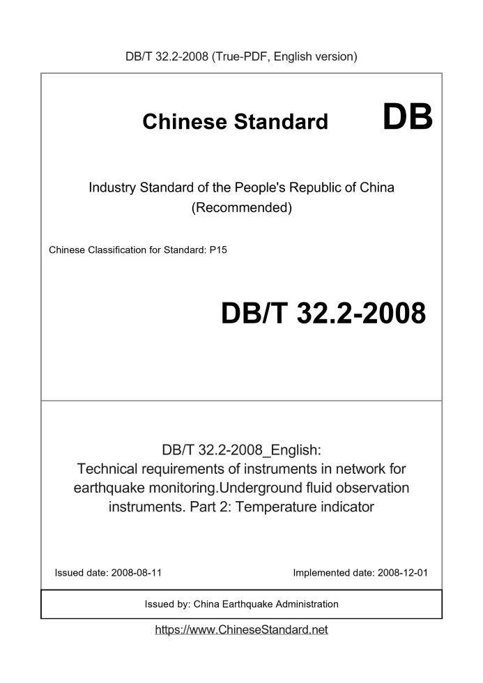 Delivery: <= 3 days. True-PDF full-copy in English will be manually translated and delivered via email. DBT32.2-2008: Technical requirements of instruments in network for earthquake monitoring.Underground fluid observation instruments. Part 2: Temperature indicator Status: Valid