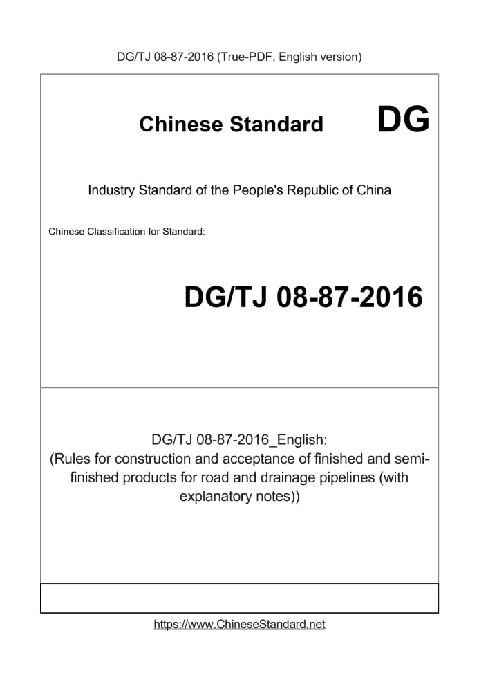 Delivery: <= 10 days. True-PDF full-copy in English will be manually translated and delivered via email. DGTJ08-87-2016: (Rules for construction and acceptance of finished and semi-finished products for road and drainage pipelines (with explanatory notes)) Status: Valid