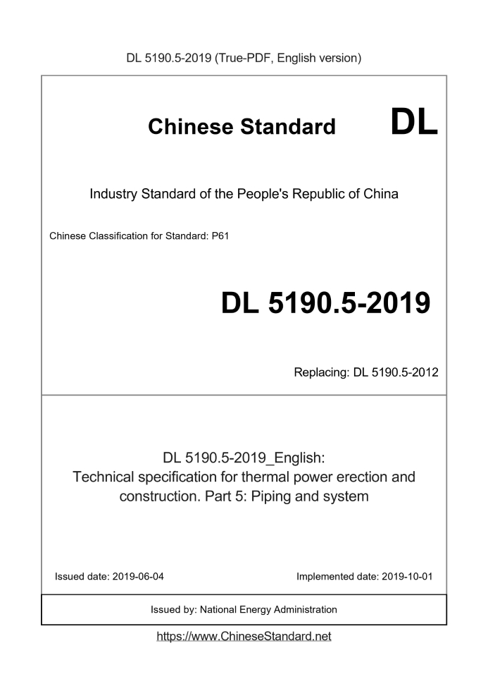 Basic dataStandard ID: DL 5190.5-2019 (DL5190.5-2019)Description (Translated English): Technical specification for thermal power erection and construction. Part 5: Piping and system Sector / Industry: Electricity & Power Industry Standard Classification of Chinese Standard: P61 Classification of International Standard: 27.100 Word Count Estimation: 94,986 Date of Issue: 2019-06-04 Date of Implementation: 2019-10-01 Older Standard (superseded by this standard): DL 5190.5-2012 Quoted Standard: GB 12348 Regulation (derived from): Natural Resources Department Announcement No. 7 of 2019 Issuing agency(ies): National Energy Administration Summary: This standard applies to the construction of new, expanded or renovated thermal power generating units and conventional nuclear power island metal pipelines. DL 5190.5-2019: Technical specification for thermal power erection and construction. Part 5: Piping and system---This is a DRAFT version for illustration, not a final translation. Full copy of true-PDF in English version (including equations, symbols, images, flow-chart, tables, and figures etc.) will be manually/carefully translated upon your order. Technical specification for thermal power erection and construction-Part 5.Piping and system ICS 27.100 P 61 Record number. 60035-2017 People's Republic of China Electric Power Industry Standard P DL/T 5190.5-2019 Replace DL/T 5190.5-2012 Technical specifications for electric power construction Part 5.Piping and System 2019-6-4 release 2019-10-01 implementation Issued by National Energy Administration ForewordThis part is based on the "Industrial Standards System (Revision) Plan for the Energy Sector of the National Energy Administration on Issuing the.2017 And the English version of the translation and publication plan (Guoneng Zongtong Technology [2017] No. 52) requirements, in the "Power Construction Facilities Technical Specifications Part 5.Piping and Systems" DL 5190.5-2012 revised on the basis of. There are 9 parts in DL/T 5190 "Technical Specifications for Electric Power Construction Construction". --Part 1.Civil Engineering --Part 2.Boiler unit --Part 3.Steam Turbine Generator Set --Part 4.Thermal instrument and control device --Part 5.Piping and System --Part 6.Water treatment and hydrogen production equipment and systems --Part 8.Processing and Preparation --Part 9.Hydraulic structure This part is Part 5 of DL/T 5190.Piping and System This part is divided into 7 chapters, the main technical content includes. general rules, terminology, basic regulations, pipeline components and pipeline support Hanger inspection, pipeline installation, pipeline system test and cleaning, project acceptance documents, appendices, etc. The main contents of this section are as follows. 1 Add and modify some terms; 2 Add technical regulations for factory processing and preparation of medium and low pressure pipelines; 3 Add technical regulations for the construction of temporary pipeline systems for main steam, reheat steam and auxiliary steam purging; 4 Add technical regulations for filter and compensator inspection; 5 The appendix adds relevant regulations on the identification of the flow direction of the pipeline medium in the power plant; 6 Delete the installation regulations for oxygen and acetylene gas pipelines; This part was proposed by the China Electricity Council. This part is under the jurisdiction of the Thermal Power Construction Standardization Technical Committee of the Electric Power Industry. Editor-in-chief of this section. China Energy Construction Group Anhui Electric Power Construction First Engineering Co., Ltd., China Energy Construction Group Guangdong Thermal Power Engineering Co., Ltd. Participating units of this section. China Power Construction Group Nuclear Power Engineering Co., Ltd., State Nuclear Power Planning and Design Institute Co., Ltd. Division, China Power Construction Group Hebei Electric Power Survey and Design Research Institute Co., Ltd. The main drafters of this section. Chen Hu, Zeng Fei, Zhang Qingnian, Li Aixiang, Bai Jinde, Wang Zijie, Tong Wenjun, Zheng Jiu De, Zheng Qingdi, Zhang Shaomin, Jia Guangming, Yue Zengzhi, Liu Yang, Rao Chonghui, Yang Lihui, Lu Shaosheng The main reviewers of this section. Li Runlin, Zhao Ning, Zhao Zhuren, Le Jiaran, Lu Jianguo, Li Yimin, Wang Dongxin, Zhang Wen Sheng, Sun Xuzhan, Liu Zhongchuan, Jia Zhiyong, Liu Guangting, Yang Tierong, Liu Wenjin, Zhi Xiaojun This part replaces "Technical Specifications for Electric Power Construction Part 5.Piping and System" DL from the date of implementation 5190.5-2012. The opinions or suggestions during the implementation of this part are fed back to the Standardization Management Center of the China Electricity Council (local Address. No. 1 Ertiao, Baiguang Road, Beijing, Postal Code. 100761). DL/T 5190.5-2019Table of contents1 General...1 2 Terminology...2 3 Basic regulations...4 4 Inspection of piping components and supports and hangers...5 4.1 General regulations...5 4.2 Pipe inspection...5 4.3 Pipe fitting inspection...5 4.4 Inspection of flanges, gaskets and fasteners...6 4.5 Valve Inspection...7 4.6 Inspection of filter screen and compensator...8 4.7 Support and hanger inspection...8 5 Piping installation...9 5.1 General regulations...9 5.2 Pipeline factory processing and preparation...11 5.3 Installation of the four major pipelines...13 5.4 Middle and low pressure pipeline installation...14 5.5 Installation of DN65 and below pipelines...14 5.6 Installation of valves and other piping components...14 5.7 Support and hanger installation...16 5.8 Installation of temporary system for main steam and reheat steam purging...17 5.9 Installation of auxiliary steam purge temporary system...18 6 Pressure test and cleaning of piping system...20 6.1 Tightness test of soda piping system...20 6.2 Pressure test of compressed air piping system...21 6.3 Piping system cleaning...21 7 Pipeline installation technical documents...23 Appendix A Paint Color 