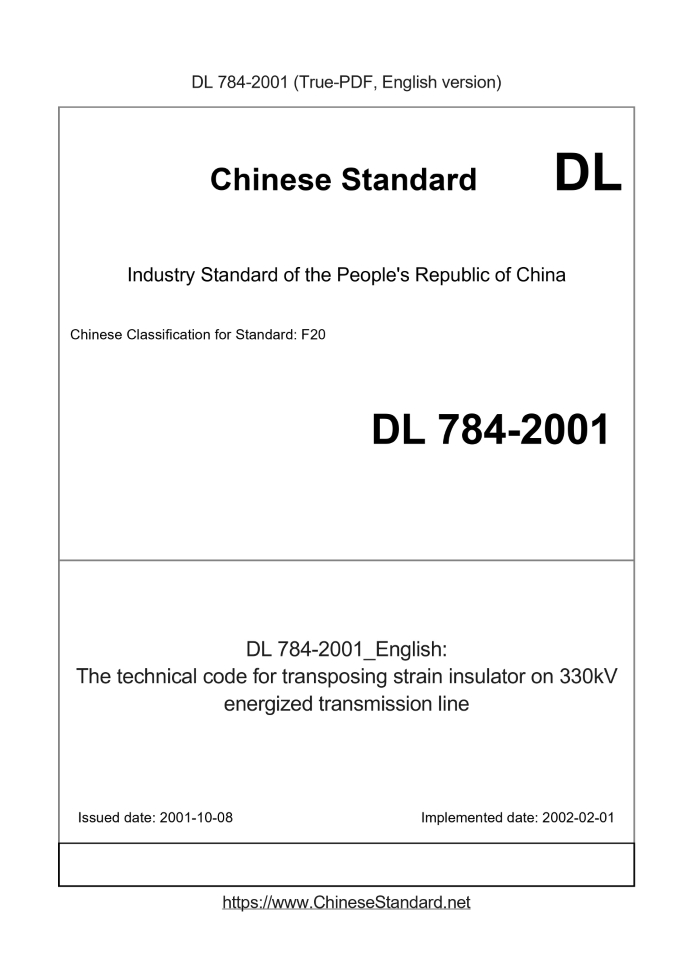 Delivery: <= 3 days. True-PDF full-copy in English will be manually translated and delivered via email. DL 784-2001: The technical code for transposing strain insulator on 330kV energized transmission line Status: Obsolete