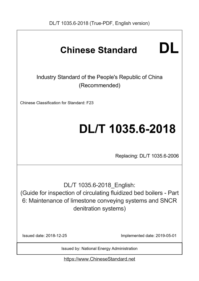 Delivery: <= 3 days. True-PDF full-copy in English will be manually translated and delivered via email. DL/T 1035.6-2018: (Guide for inspection of circulating fluidized bed boilers - Part 6: Maintenance of limestone conveying systems and SNCR denitration systems) Status: Valid DL/T 1035.6: Historical versions