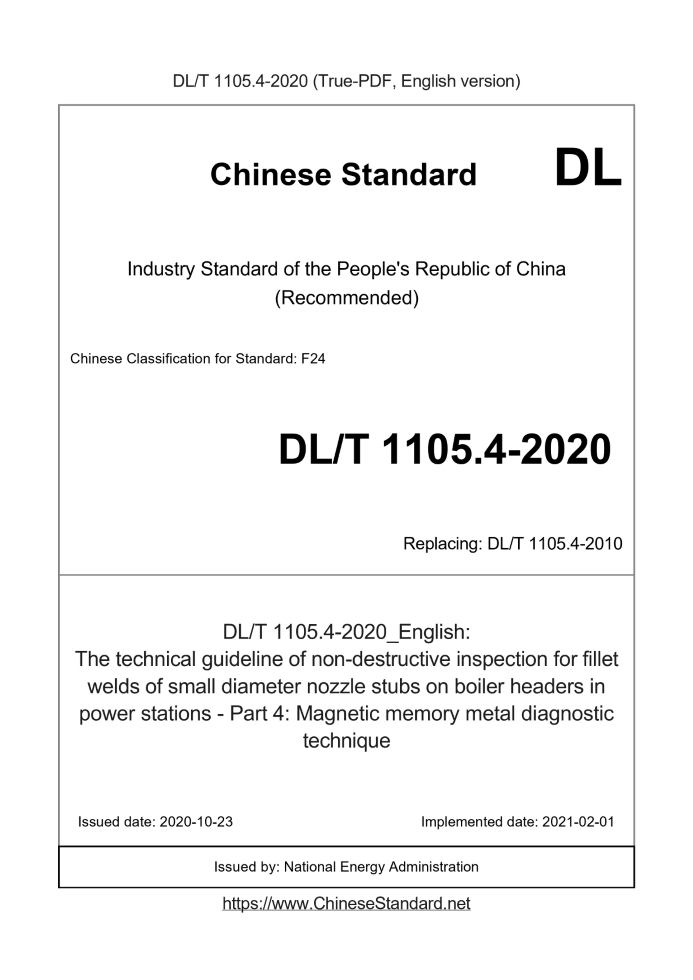 Delivery: <= 3 days. True-PDF full-copy in English will be manually translated and delivered via email. DL/T 1105.4-2020: The technical guideline of non-destructive inspection for fillet welds of small diameter nozzle stubs on boiler headers in power stations - Part 4: Magnetic memory metal diagnostic technique Status: Valid DL/T 1105.4: Historical versions