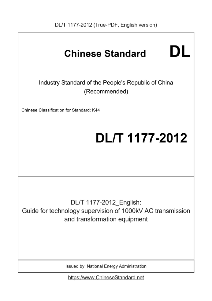 Delivery: <= 3 days. True-PDF full-copy in English will be manually translated and delivered via email. DL/T 1177-2012: Guide for technology supervision of 1000kV AC transmission and transformation equipment Status: Valid