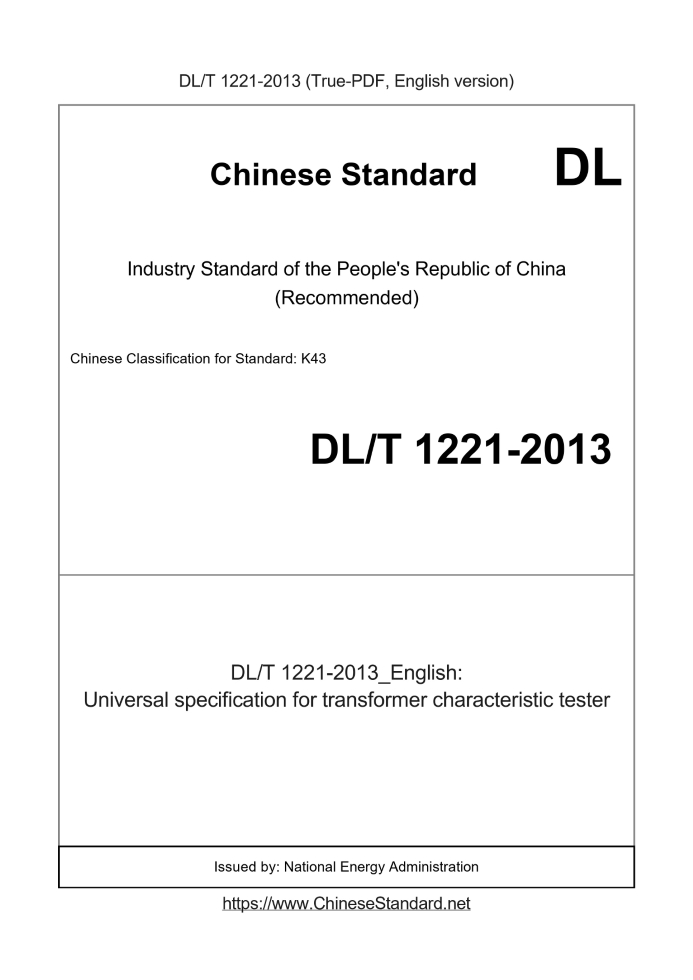 | DL/T 1221-2013 | English | 519 | Add to Cart | 4 days [Need to translate] | Universal specification for transformer characteristic tester |
