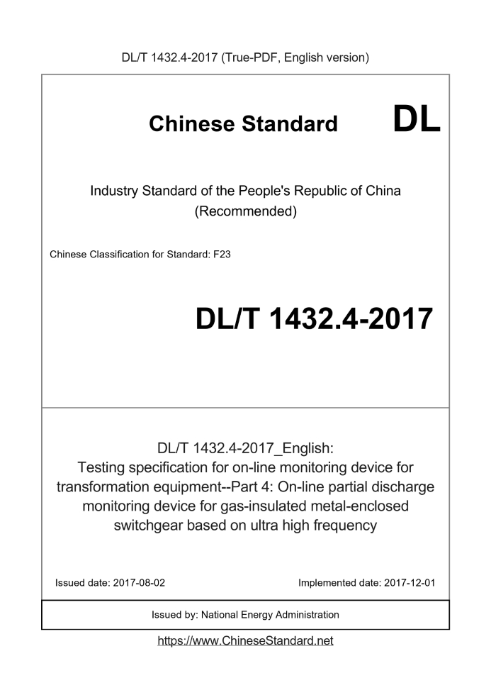 Delivery: <= 4 days. True-PDF full-copy in English will be manually translated and delivered via email. DL/T 1432.4-2017: Testing specification for on-line monitoring device for transformation equipment--Part 4: On-line partial discharge monitoring device for gas-insulated metal-enclosed switchgear based on ultra high frequency Status: Valid