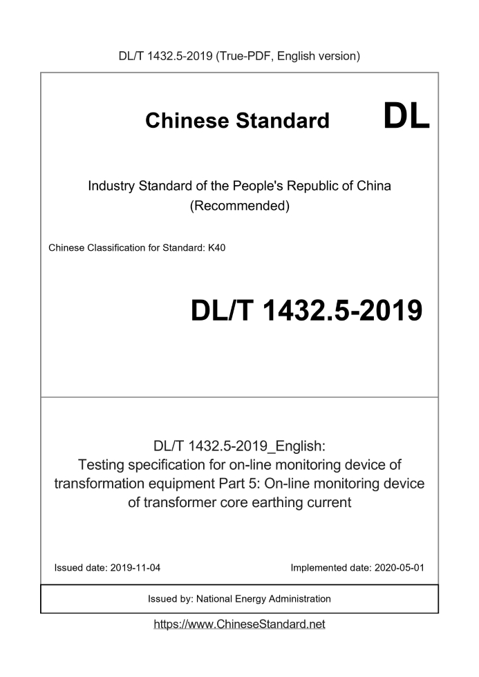 Delivery: <= 3 days. True-PDF full-copy in English will be manually translated and delivered via email. DL/T 1432.5-2019: Testing specification for on-line monitoring device of transformation equipment Part 5: On-line monitoring device of transformer core earthing current Status: Valid