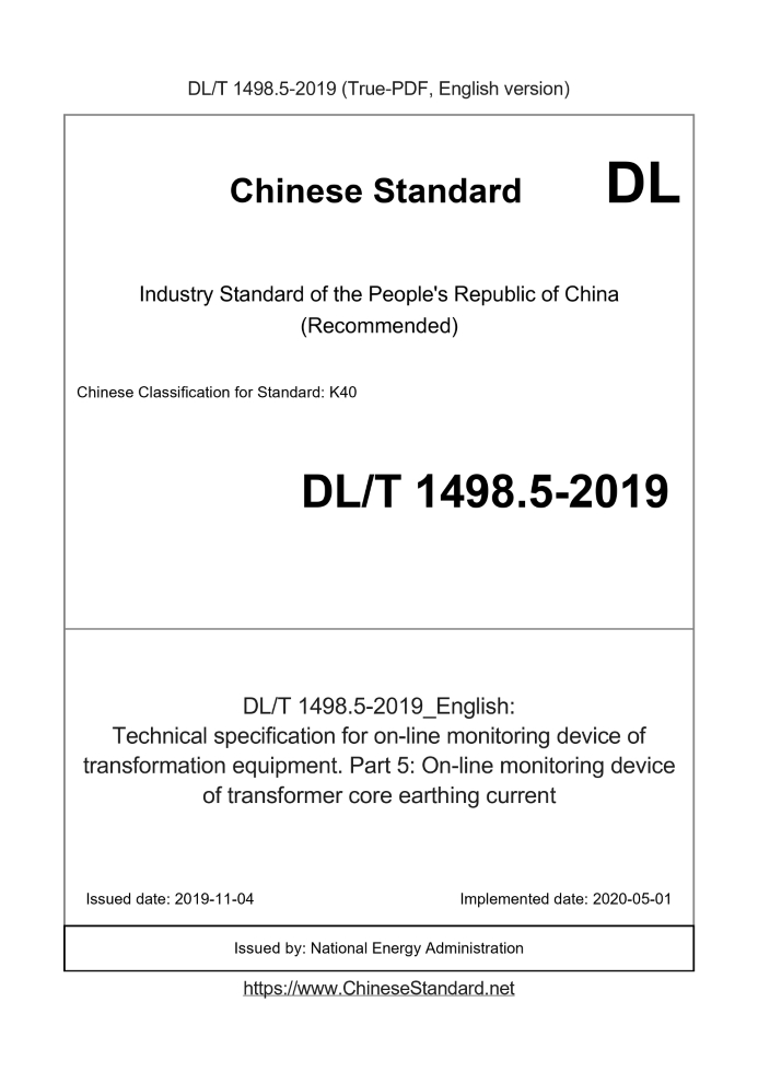 Delivery: <= 3 days. True-PDF full-copy in English will be manually translated and delivered via email. DL/T 1498.5-2019: Technical specification for on-line monitoring device of transformation equipment. Part 5: On-line monitoring device of transformer core earthing current Status: Valid