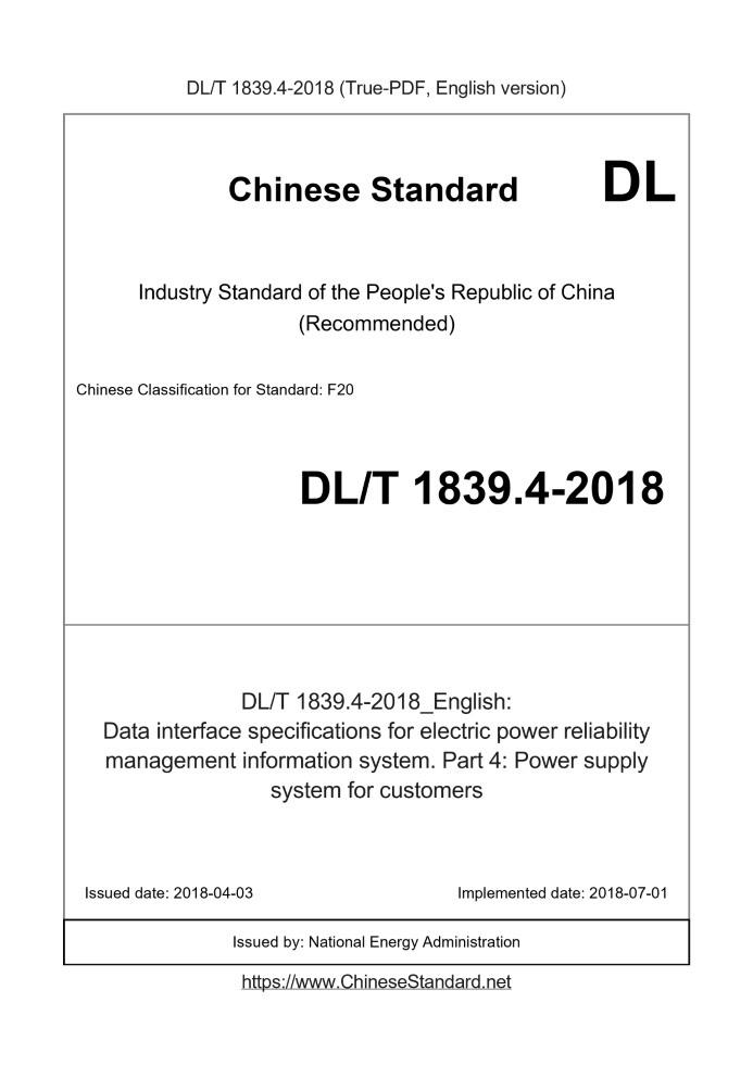 Delivery: <= 4 days. True-PDF full-copy in English will be manually translated and delivered via email. DL/T 1839.4-2018: Data interface specifications for electric power reliability management information system. Part 4: Power supply system for customers Status: Valid