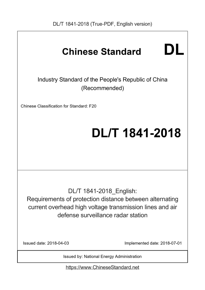 Delivery: <= 3 days. True-PDF full-copy in English will be manually translated and delivered via email. DL/T 1841-2018: Requirements of protection distance between alternating current overhead high voltage transmission lines and air defense surveillance radar station Status: Valid