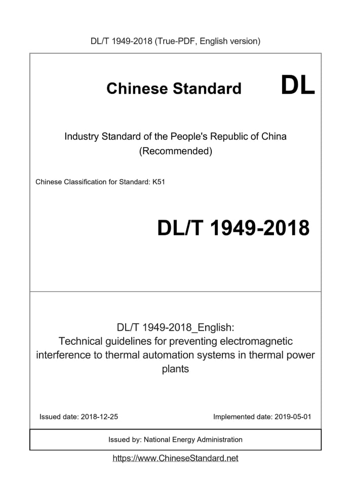 Delivery: <= 6 days. True-PDF full-copy in English will be manually translated and delivered via email. DL/T 1949-2018: Technical guidelines for preventing electromagnetic interference to thermal automation systems in thermal power plants Status: Valid