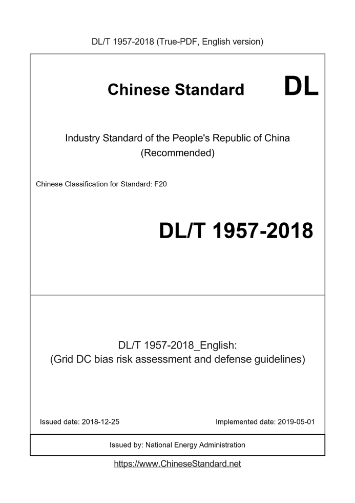 Delivery: <= 3 days. True-PDF full-copy in English will be manually translated and delivered via email. DL/T 1957-2018: (Grid DC bias risk assessment and defense guidelines) Status: Valid