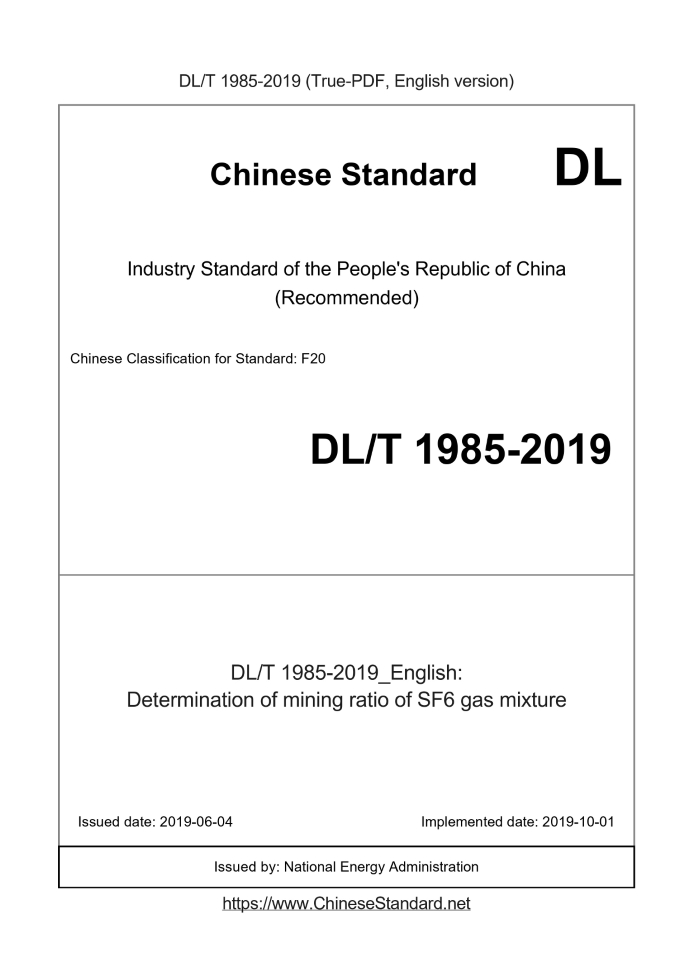 Delivery: <= 3 days. True-PDF full-copy in English will be manually translated and delivered via email. DL/T 1985-2019: Determination of mining ratio of SF6 gas mixture Status: Valid
