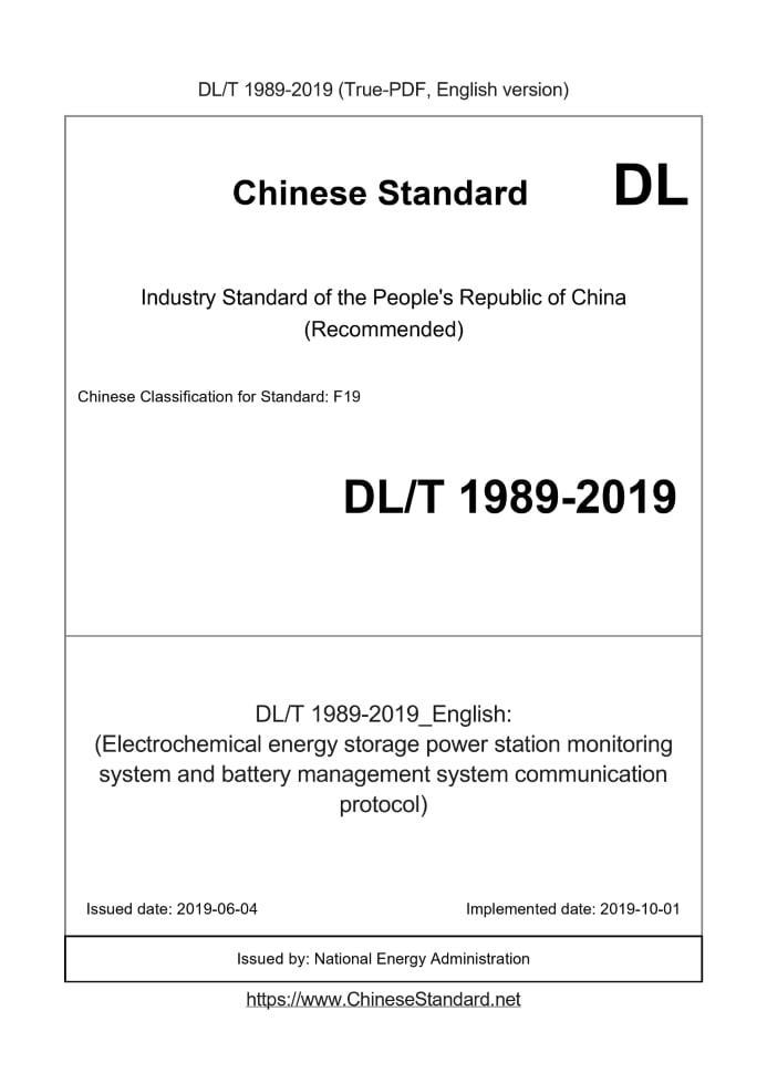 Delivery: <= 5 days. True-PDF full-copy in English will be manually translated and delivered via email. DL/T 1989-2019: (Electrochemical energy storage power station monitoring system and battery management system communication protocol) Status: Valid