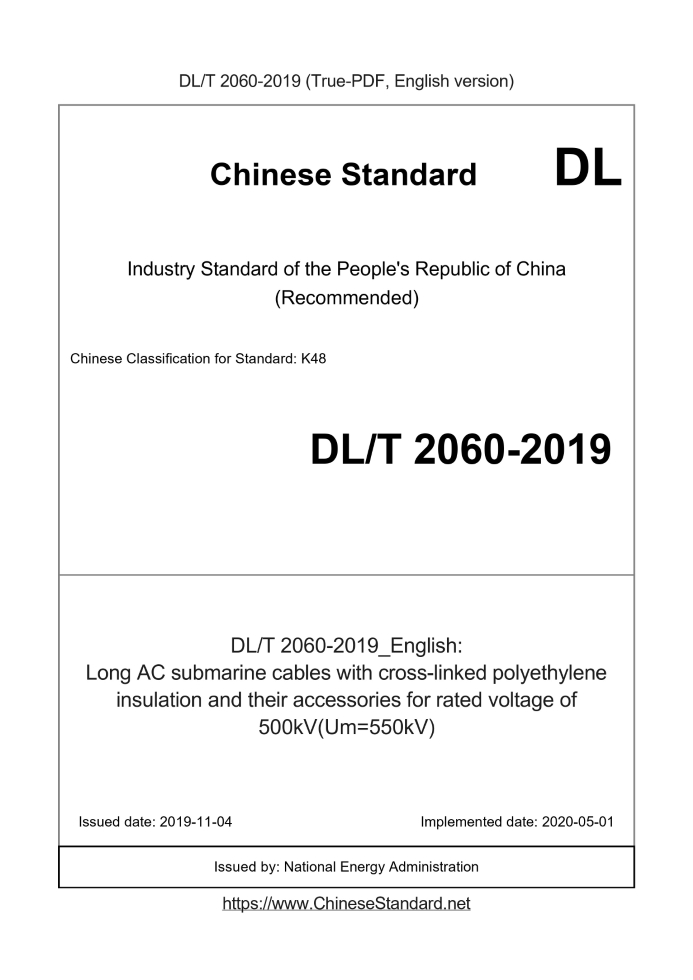 Delivery: <= 7 days. True-PDF full-copy in English will be manually translated and delivered via email. DL/T 2060-2019: Long AC submarine cables with cross-linked polyethylene insulation and their accessories for rated voltage of 500kV(Um=550kV) Status: Valid