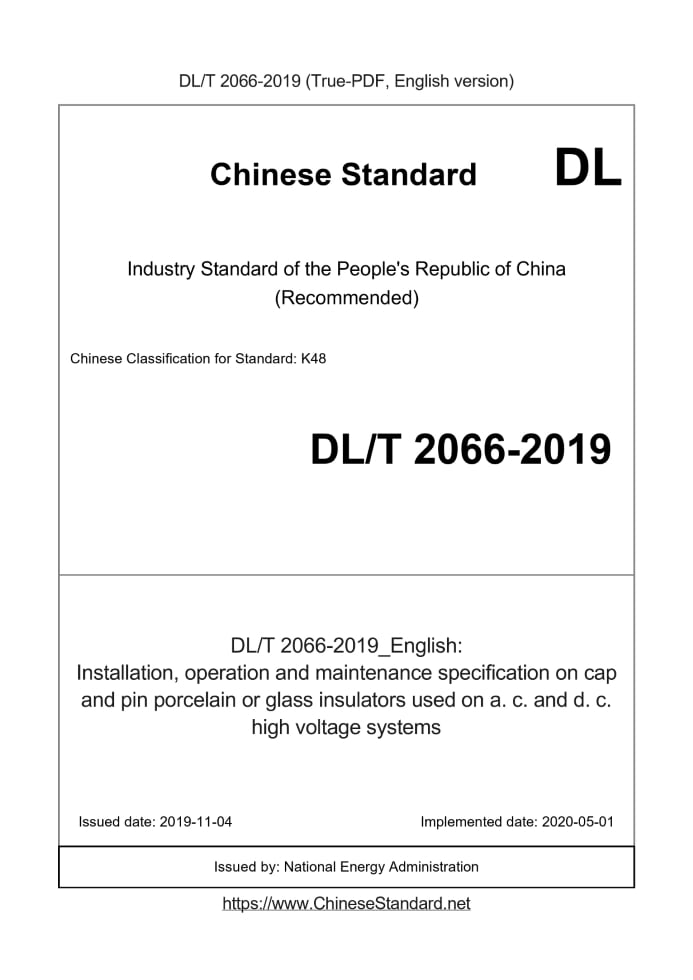 Delivery: <= 3 days. True-PDF full-copy in English will be manually translated and delivered via email. DL/T 2066-2019: Installation, operation and maintenance specification on cap and pin porcelain or glass insulators used on a. c. and d. c. high voltage systems Status: Valid