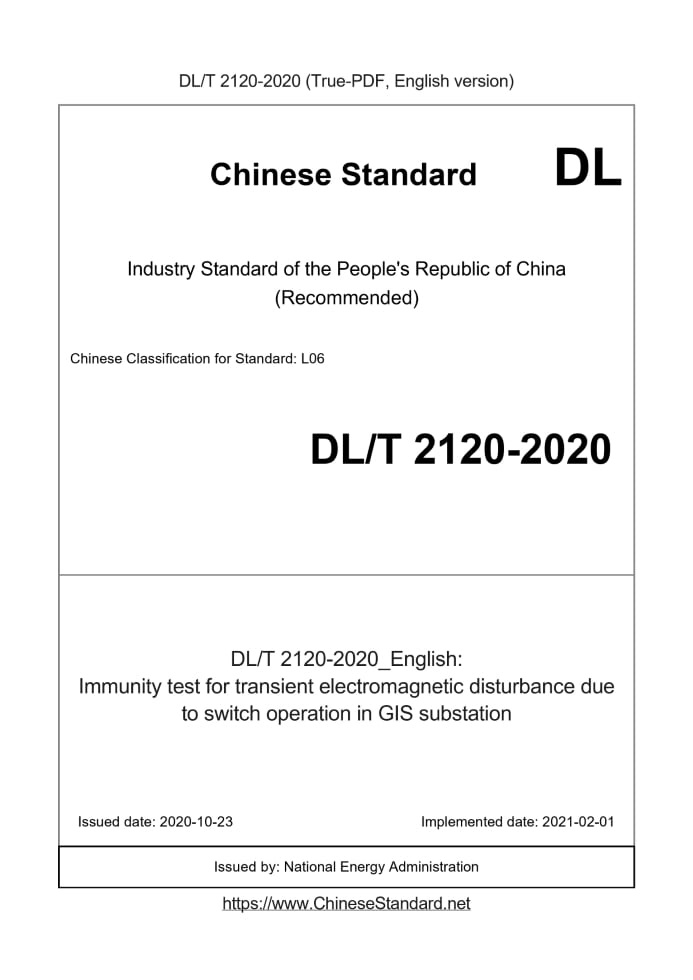 Delivery: <= 3 days. True-PDF full-copy in English will be manually translated and delivered via email. DL/T 2120-2020: Immunity test for transient electromagnetic disturbance due to switch operation in GIS substation Status: Valid