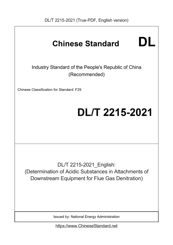 Delivery: <= 3 days. True-PDF full-copy in English will be manually translated and delivered via email. DL/T 2215-2021: (Determination of Acidic Substances in Attachments of Downstream Equipment for Flue Gas Denitration) Status: Valid