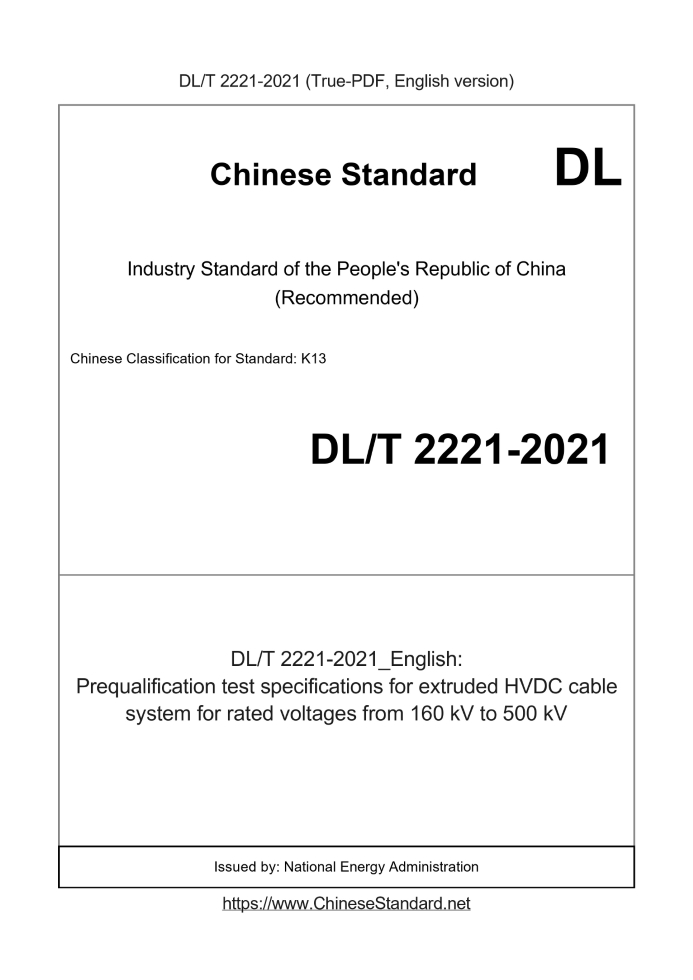 Delivery: <= 3 days. True-PDF full-copy in English will be manually translated and delivered via email. DL/T 2221-2021: Prequalification test specifications for extruded HVDC cable system for rated voltages from 160 kV to 500 kV Status: Valid