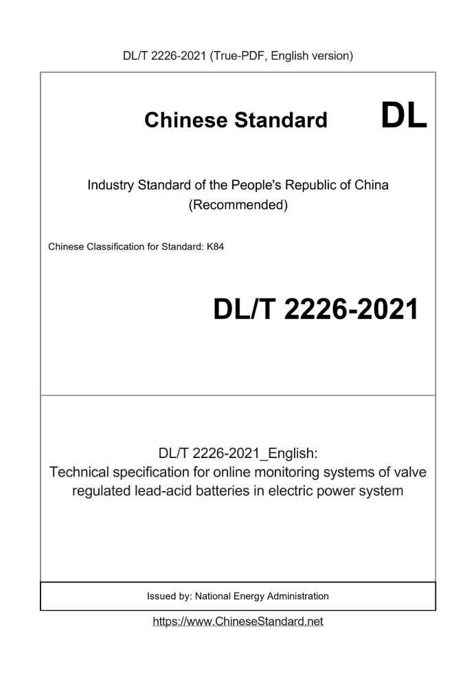Delivery: <= 5 days. True-PDF full-copy in English will be manually translated and delivered via email. DL/T 2226-2021: Technical specification for online monitoring systems of valve regulated lead-acid batteries in electric power system Status: Valid