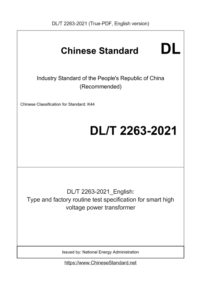 Delivery: <= 4 days. True-PDF full-copy in English will be manually translated and delivered via email. DL/T 2263-2021: Type and factory routine test specification for smart high voltage power transformer Status: Valid
