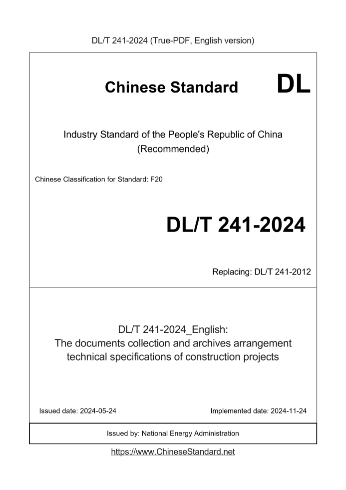 US$5889.00 · In stock · Download in 9 secondsDL/T 241-2024: The documents collection and archives arrangement technical specifications of construction projects