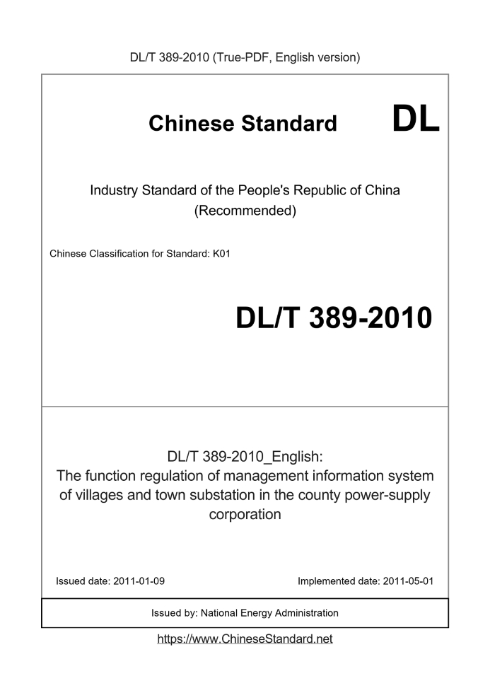 Delivery: <= 3 days. True-PDF full-copy in English will be manually translated and delivered via email. DL/T 389-2010: The function regulation of management information system of villages and town substation in the county power-supply corporation Status: Valid